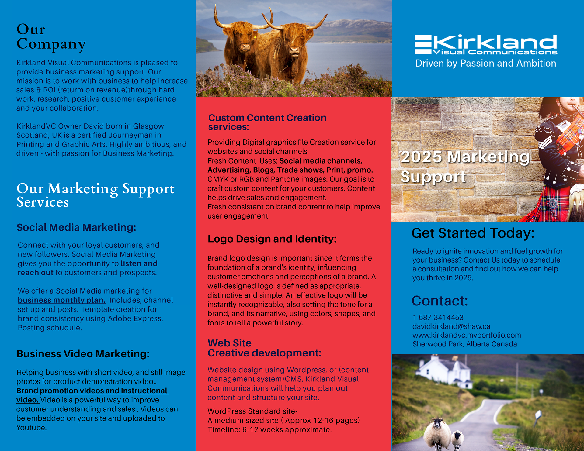 Kirkland Visual Communications is based in Sherwood Park, Alberta. David Jones Kirkland is an Alberta certified Journeyman in Print and Graphic arts. Born and raised in Scotland, UK, David has over 20 years of professional Marketing and outside sales experience. Our mission is to work with business to help increase sales & ROI through hard work, research, positive customer experience and respectful collaboration